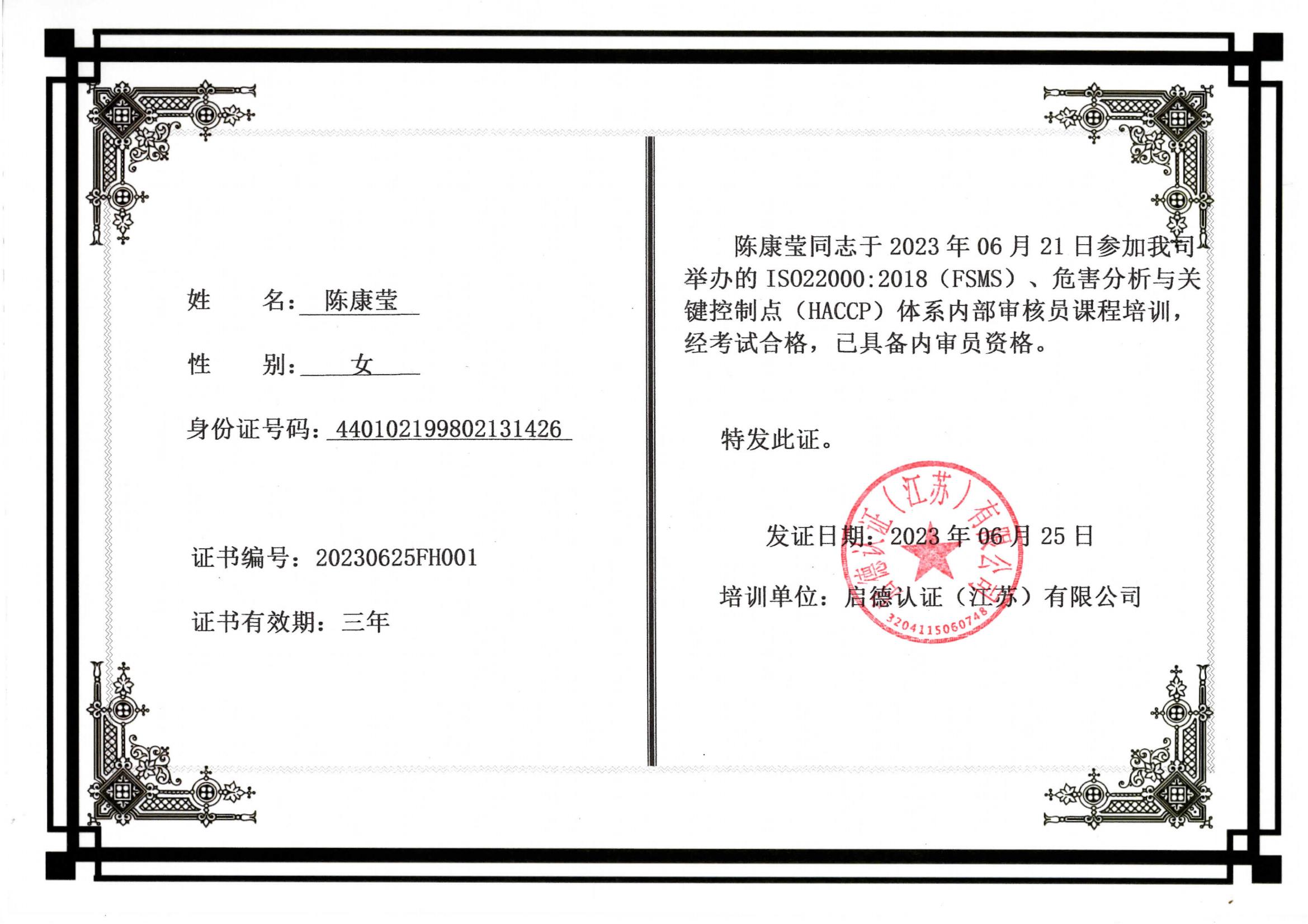 經(jīng)考試,陳康瑩 學(xué)員成績合格,已具備內(nèi)審員資格,我司于2023年6月25日頒發(fā)內(nèi)審員證書。